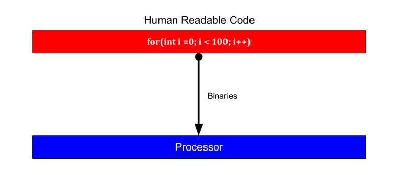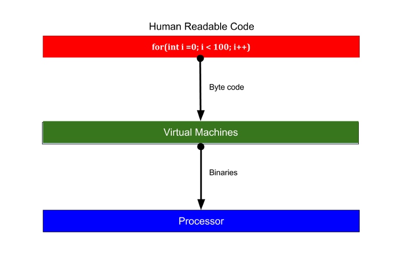 Processors understand binaries. Generally, when you build an application using Java or other JVM-based languages when you compile your project, it compiles the human readable code to byte-code which can be understood by JVM or other virtual machines that run on top of underlying OS. While execution, VM interprets those bytecodes and convert them to the binaries that processors can understand. 处理器理解二进制文件。 通常,在编译项目时使用Java或其他基于JVM的语言构建应用程序时,它会将人类可读代码编译为字节代码,JVM或在底层操作系统之上运行的其他虚拟机可以理解这些代码。 执行时,VM会解释这些字节码并将其转换为处理器可以理解的二进制文件