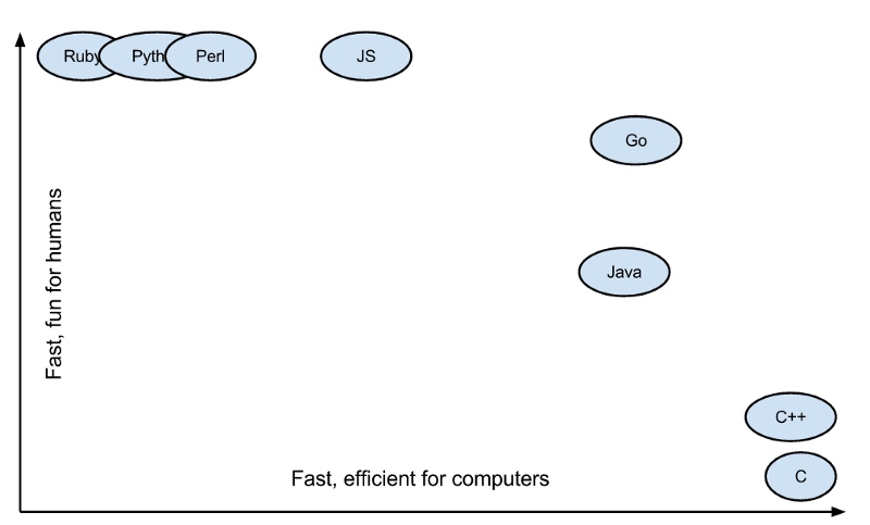 Above graph displays that Go is almost as efficient as C/C++, while keeping the code syntax simple as Ruby, Python and other languages. That is a win-win situation for both humans and processors!!! 上图显示Go几乎与C / C ++一样高效,同时保持代码语法简单,如Ruby,Python和其他语言。 对于人类和处理器来说,这是一个双赢的局面!