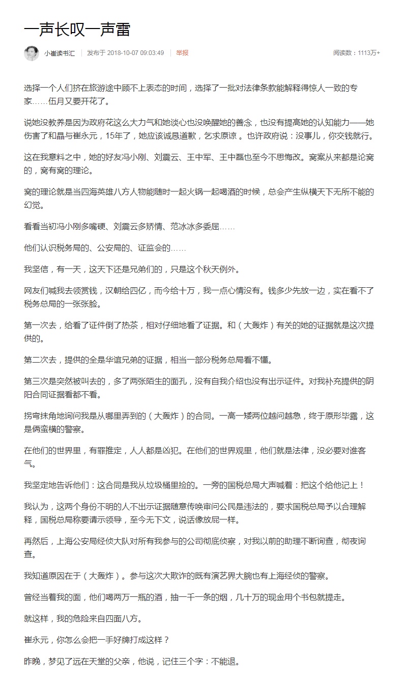 2 真的佩服崔永元,先是举报fbb,然后如下图,崔做了很多人想做不做的事,或是敢做却无法做到的事,后果就是崔面临死的威胁。中国缺少崔这样的人,愿崔平安。